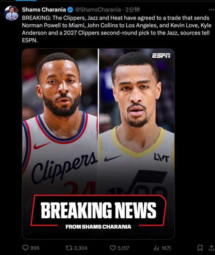 快船獲得?:爵士隊前鋒科林斯,補強四號位短板,科林斯作為準全明星級別大前鋒,可提升內線攻防能力。